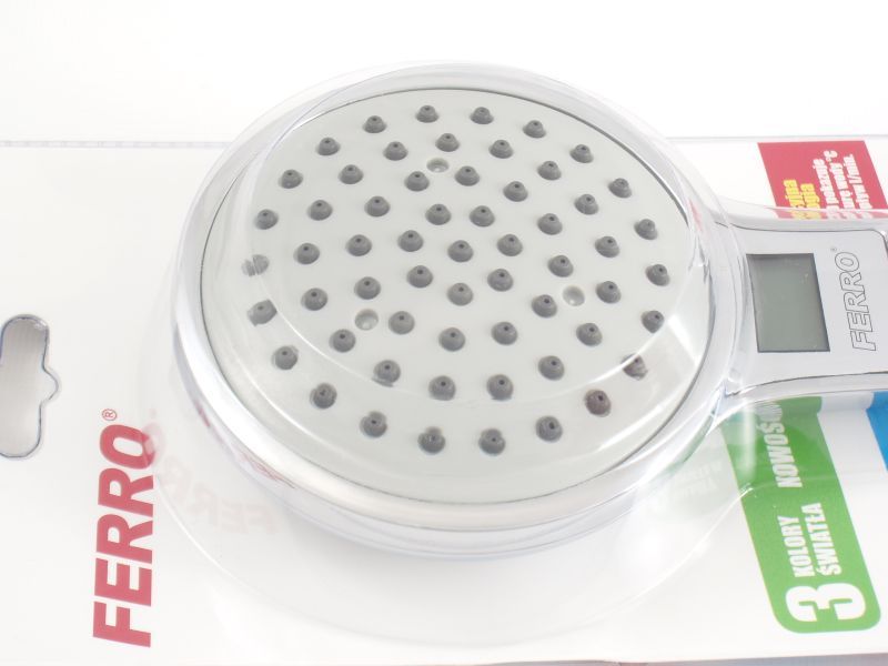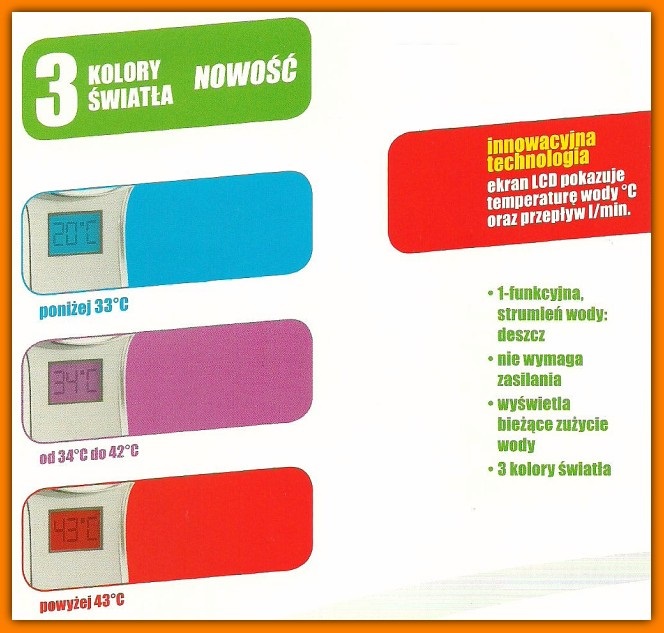 Posiada 3 kolory światła wskazujace temperaturę - funkcja ta idealnie sprawdzi sie dla osób posiadających dzieci. Ponadtto wskazuje pomiar ilości przepływu wody. Nie wymaga zasilania bateryjnego.